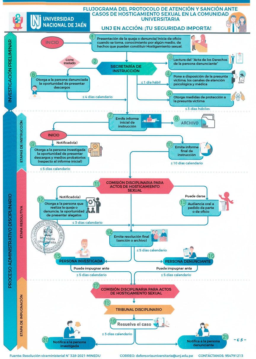 - La Universidad Nacional de Jaén pone a disposición de su Comunidad Universitaria y toda persona relacionada a ella, el Reglamento Interno de Prevención y Sanción de Hostigamiento Sexual de la universidad, basado en la Ley N° 27942, Ley de Prevención y Sanción Sexual y su respectivo reglamento D.S. N° 014-2019-MIMP. Reglamento de Prevención y Sanción para los casos de Hostigamiento Sexual de la Universidad Nacional de Jaén aprobado con Resolución N° 226-2023-CO-UNJ. Todo ello, su accionar en el marco del debido proceso y con los plazos establecidos en el flujo del procedimiento.